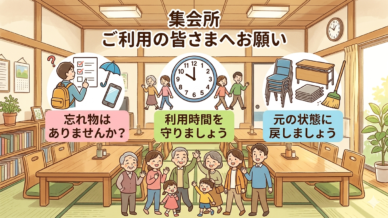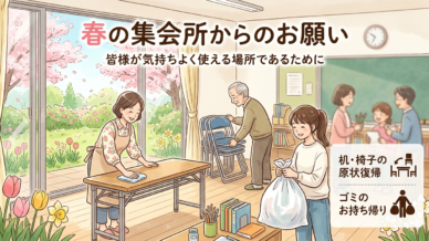日頃より集会所をご利用いただき、誠にありがとうございます。地域の皆さまの交流の場として、多くの方にご活用いただき、大変うれしく思っております。最近、ご利用後の忘れ物が見受けられることがございます。お帰...